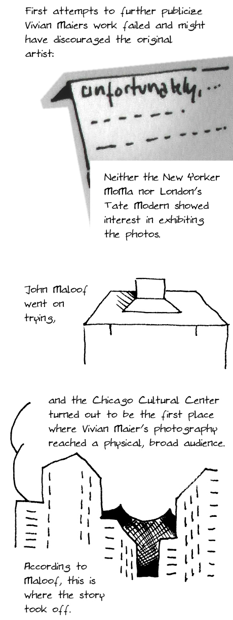 After developing the photos, John Maloof chose a modern way to expose her work, by putting it on tumblr and letting the internet audience decide about the quality. Positive resonance received, he probably gained enough motivation to pursue the search of suited exhibition platforms, and despite the daunting task, he finally was successful.