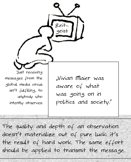 Vivian Maier never had the chance to interact with her (potential) public, so her story is a sad one, regardless of her late recognition we are witnessing. For us, though, now is the time to publish our doings and to interact with whoever might be interested in what we do and what we like. Our lifetime is the precious moment to enjoy our own creativity. And we rarely live up to the potential of our own skills. I often notice that people don’t acknowledge their own skills because what one is able to do well always seems so normal, natural to oneself.