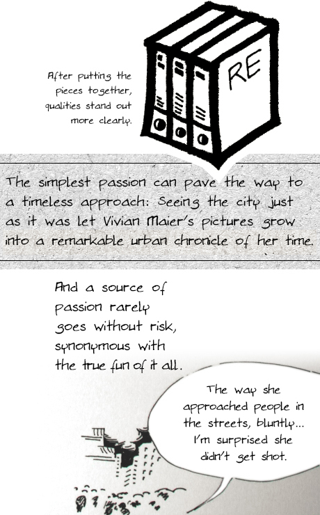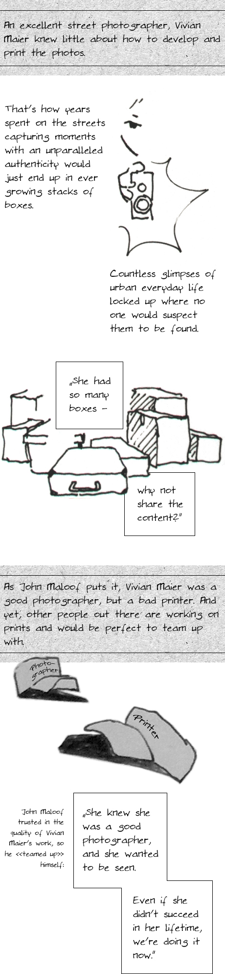 Even in the truthful realization of a lack lies the power to search for a compensation, for help. And there has never been a better time to search for each other, to connect and unite forces in order to get better things and projects done, better stories told. The making of “Finding Vivian Maier” is just one excellent example of it.
